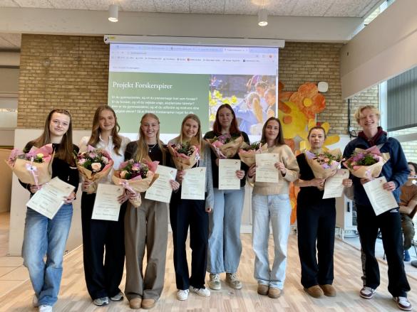 Ved morgensamlingen d. 15. januar, blev vores 8 3.g-elever, som har gennemført Projekt Forskerspirer 2025 og fået godkendt deres forskerspireprojekt, fejret i kantinen med blomster og diplomer.