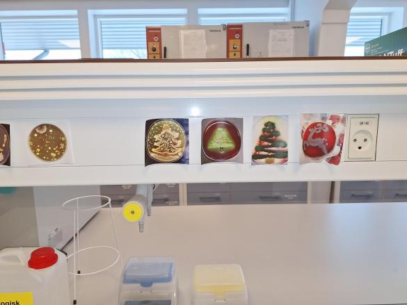 Besøget indeholdt også en rundtur i laboratoriet, hvor eleverne så hvordan det også er muligt at lave jule-”kunst” med bakteriekulturer.
