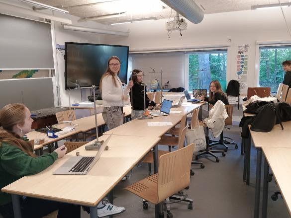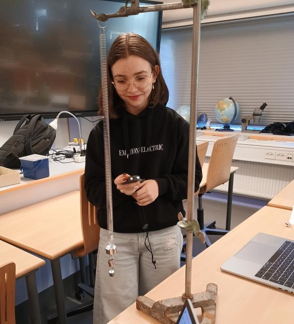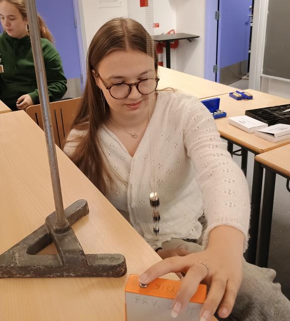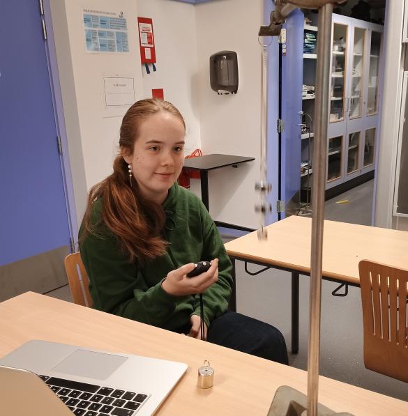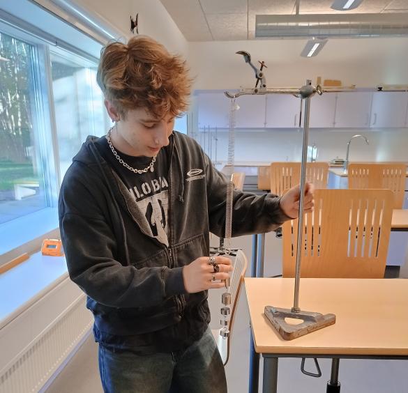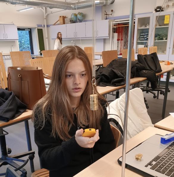 Fysik A holdet laver forsøg med harmoniske svingninger. Her undersøger eleverne sammenhængen mellem svingningstiden, som måles med et stopur, og massen af lodderne der hænger i fjederen.