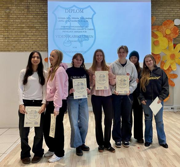 Süreyya, Julie, Viktoria, Tilde, Andrea, Lærke, Luna og Cecilie fra 2b og 2x har med engagement og ansvarsbevdsthed udført 25 timers frivilligt arbejde for videnskabsklubben efteråret 2025 som seniormentorer.